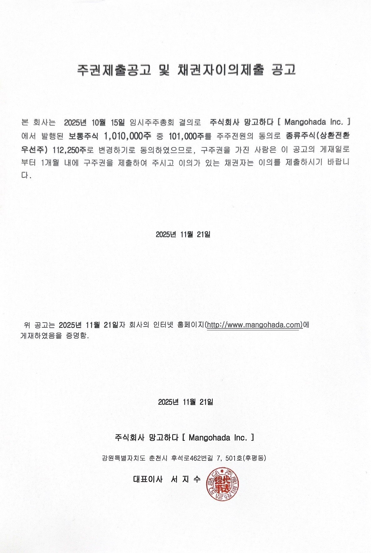 대표이사 : 서지수 사업자 등록번호 : 367-87-02770 통신판매업 : 제2024-수원영통-1380호 contact@mangohada.com